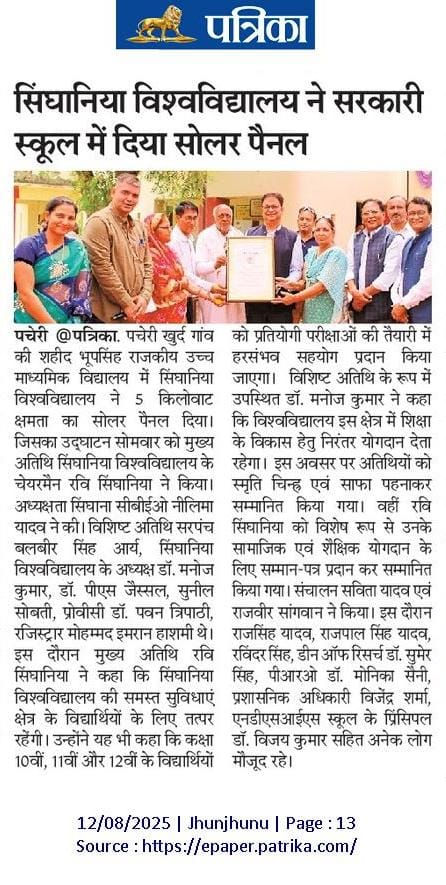 शहीद भूपसिंह राजकीय उच्च माध्यमिक विद्यालय में 5 किलोवाट सौर ऊर्जा संयंत्र का उद्घाटन सिंघानिया विश्वविद्यालय द्वारा किया गया