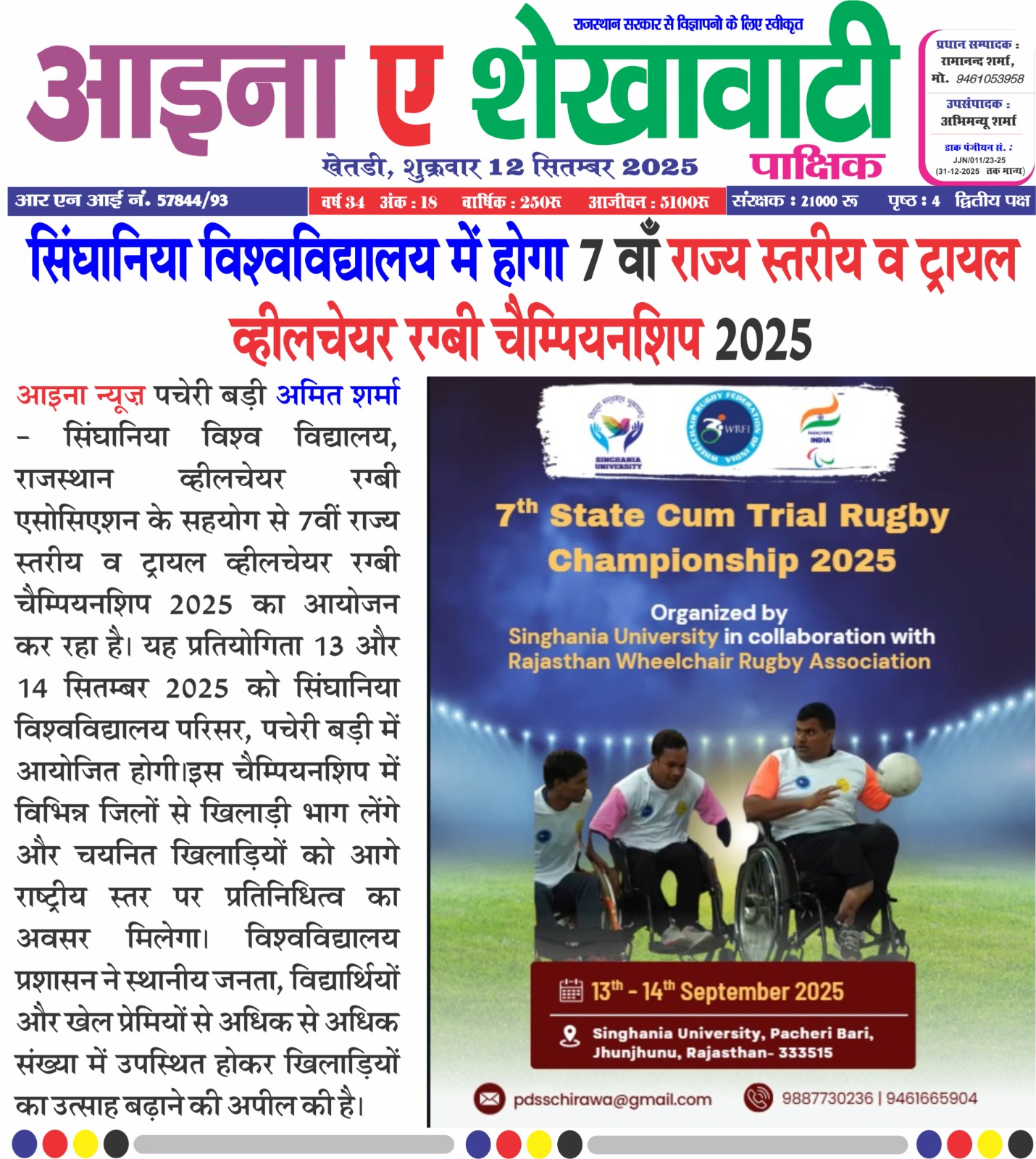 7th State-cum-Trial Wheelchair Rugby Championship 2025 Scheduled at Singhania University on 13th 14th September