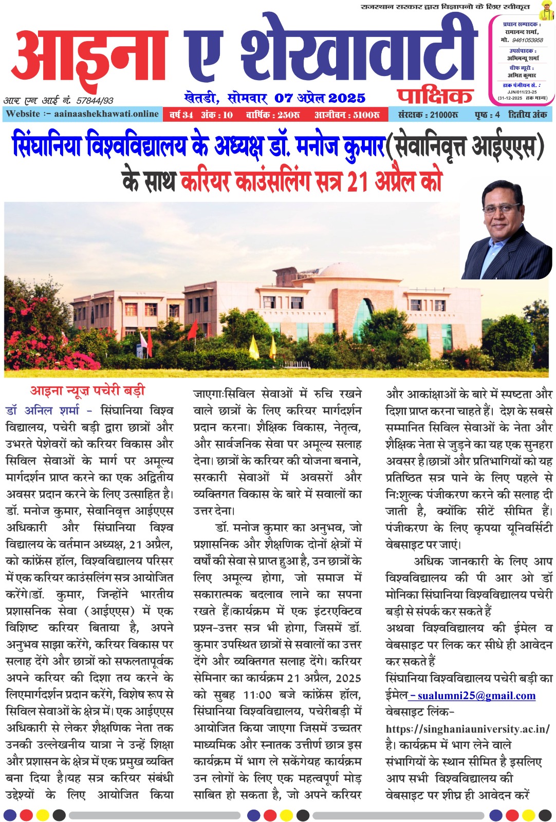 सिंघानिया विश्वविद्यालय के अध्यक्ष डॉ. मनोज कुमार (सेवानिवृत्त आईएएस) के साथ करियर काउंसलिंग सत्र