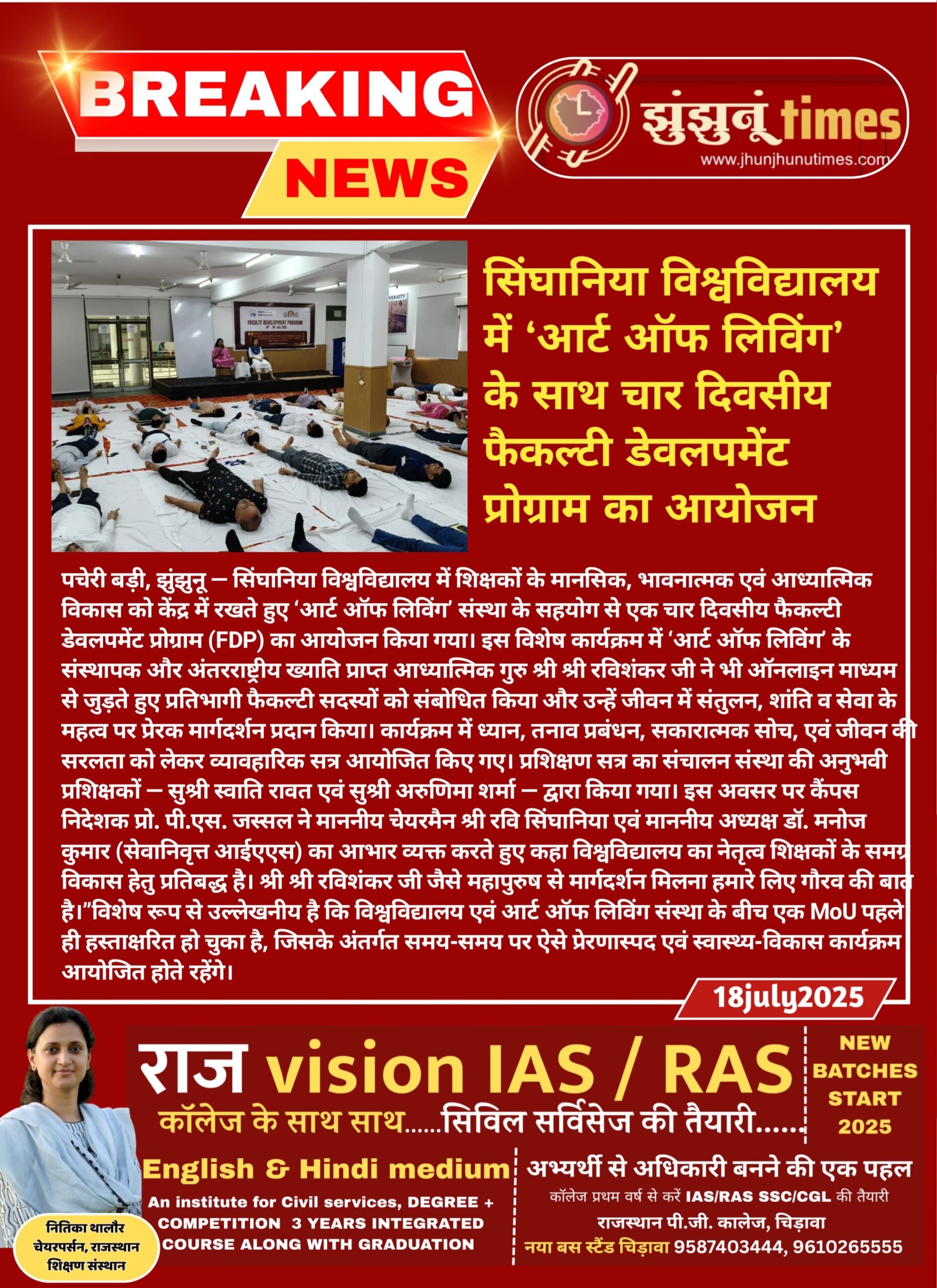 सिंघानिया विश्वविद्यालय में द आर्ट ऑफ लिविंग के सहयोग से फैकल्टी डेवलपमेंट प्रोग्राम आयोजित हुआ