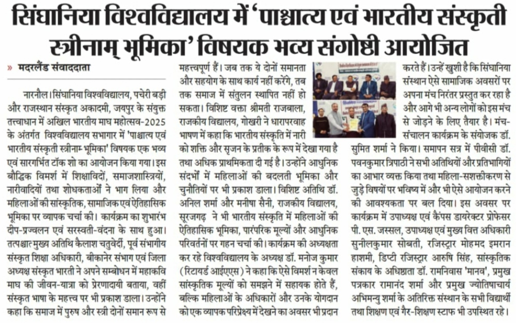 सिंघानिया विश्वविद्यालय में ‘पाश्चात्य एवं भारतीय संस्कृती स्त्रीनाम् भूमिका’ विषयक भव्य संगोष्ठी आयोजित