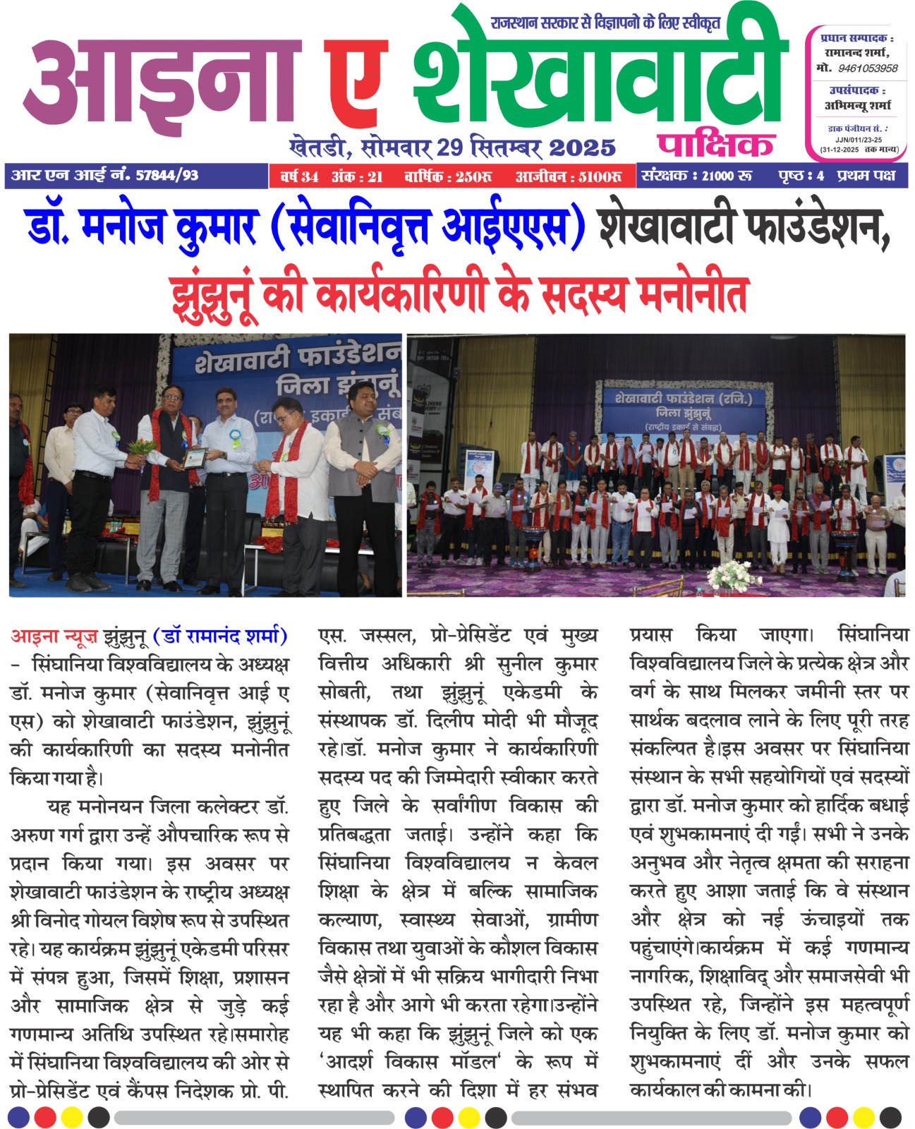 डॉ. मनोज कुमार, आईएएस (सेवानिवृत्त) शेखावाटी फाउंडेशन, झुंझुनूं की कार्यकारिणी समिति के सदस्य बने