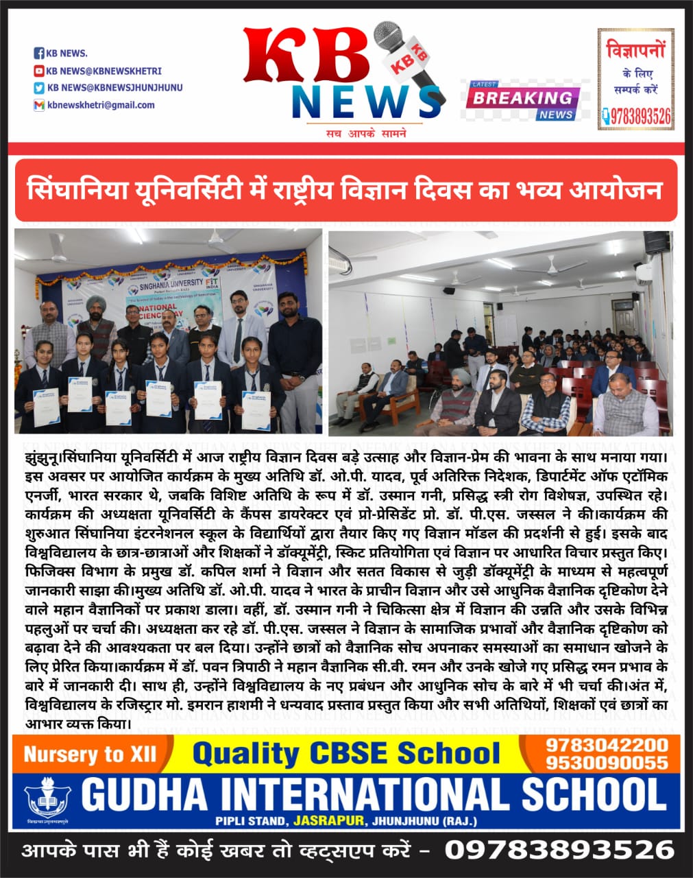 Grand celebration of National Science Day at Singhania University March 1, 2025 Anju Gupta 0 सिंघानिया यूनिवर्सिटी में राष्ट्रीय विज्ञान दिवस का भव्य आयोजन