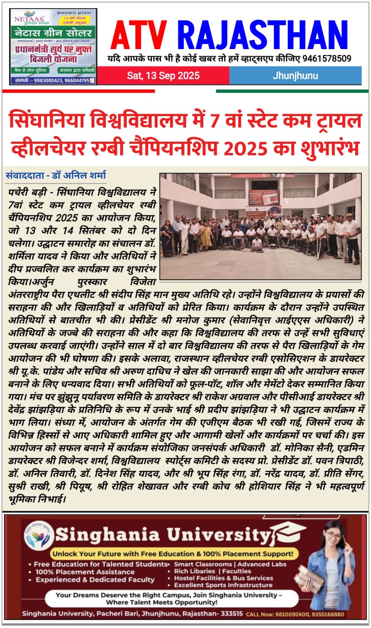 सिंघानिया विश्वविद्यालय में 7वाँ स्टेट-कम-ट्रायल व्हीलचेयर रग्बी चैंपियनशिप 2025 का भव्य उद्घाटन