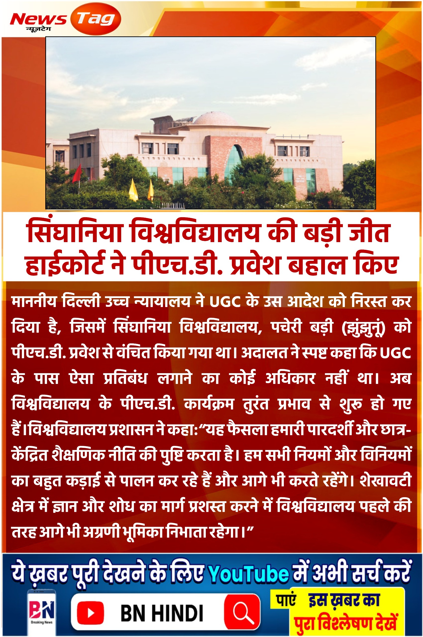 माननीय दिल्ली उच्च न्यायालय ने सिंघानिया विश्वविद्यालय में पीएचडी प्रवेश के लिए रास्ता साफ किया