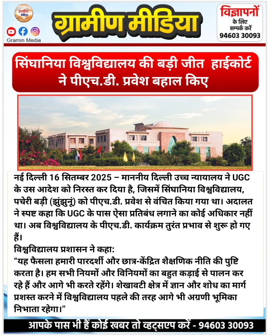 माननीय दिल्ली उच्च न्यायालय ने सिंघानिया विश्वविद्यालय को पीएचडी छात्रों को प्रवेश देने की अनुमति दी
