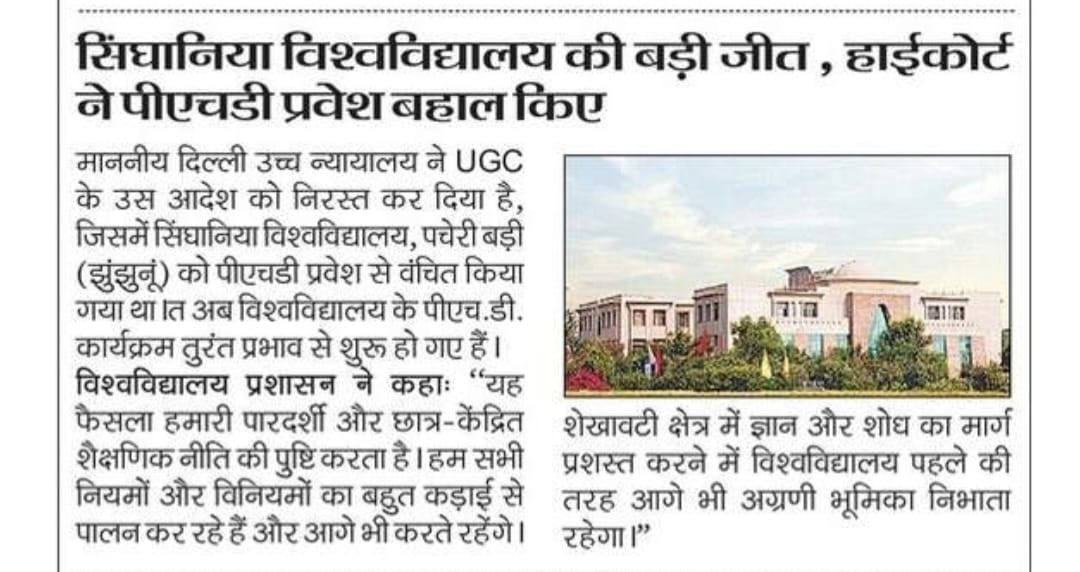माननीय दिल्ली उच्च न्यायालय ने सिंघानिया विश्वविद्यालय को पीएचडी प्रवेश फिर से शुरू करने की अनुमति दी