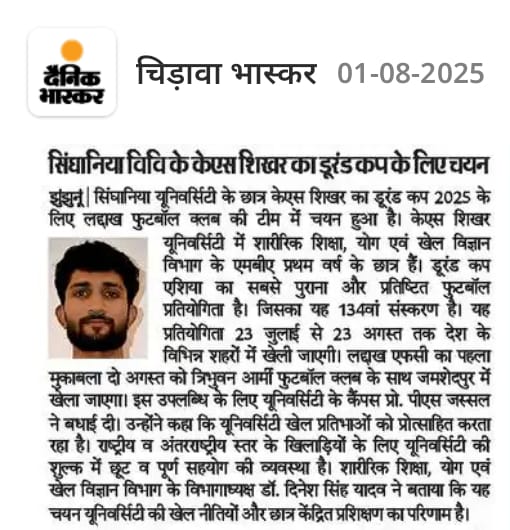 सिंघानिया विश्वविद्यालय के छात्र के.एस. शिखर डूरंड कप 2025 में लद्दाख फुटबॉल क्लब का प्रतिनिधित्व करेंगे