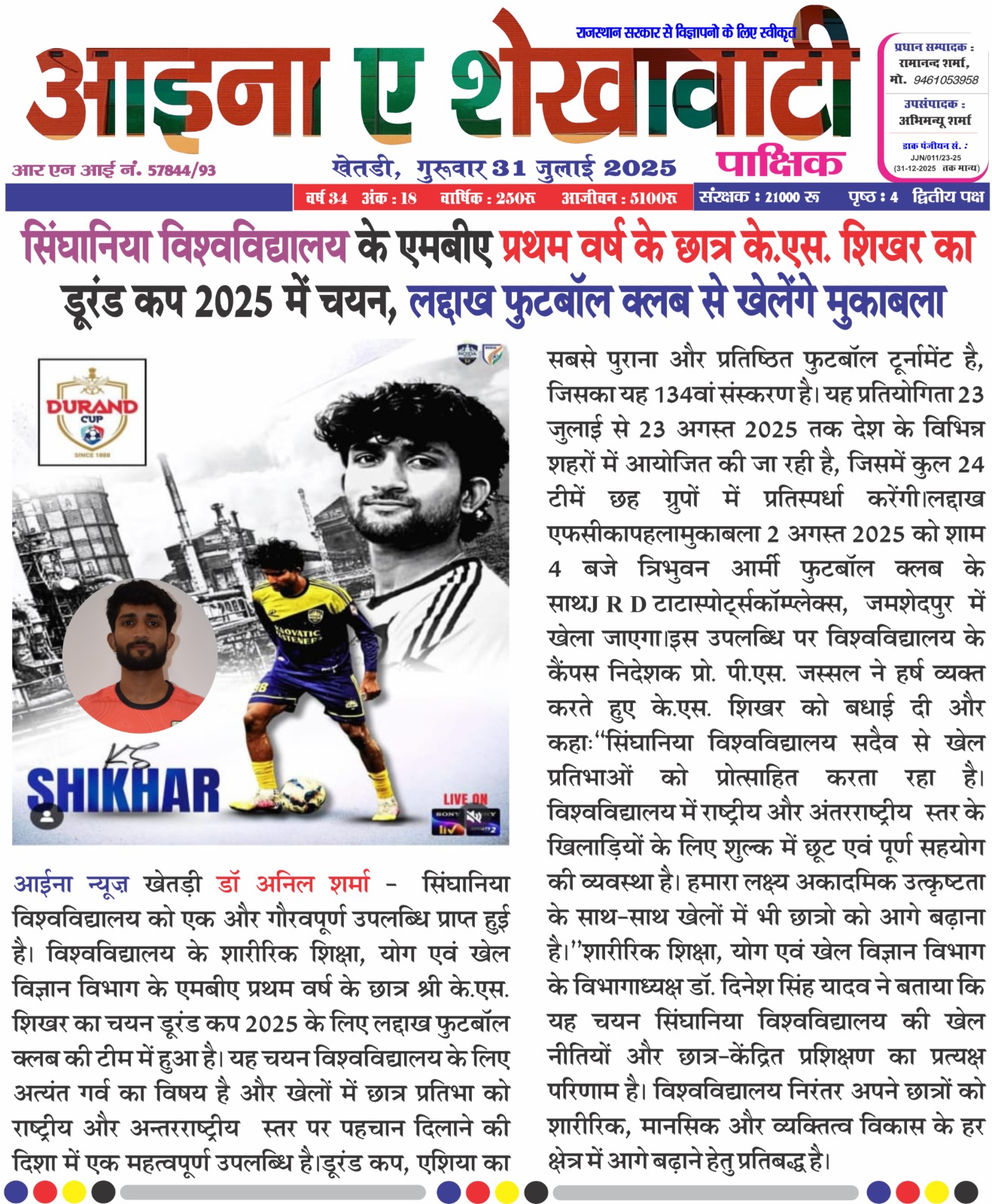 सिंघानिया विश्वविद्यालय से एमबीए कर रहे के.एस. शिखर का लद्दाख फुटबॉल क्लब में डूरंड कप 2025 के लिए चयन