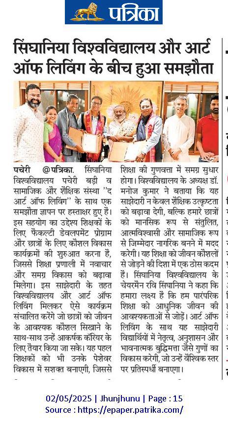 सिंघानिया विश्वविद्यालय और द आर्ट ऑफ लिविंग के बीच हुआ MOU