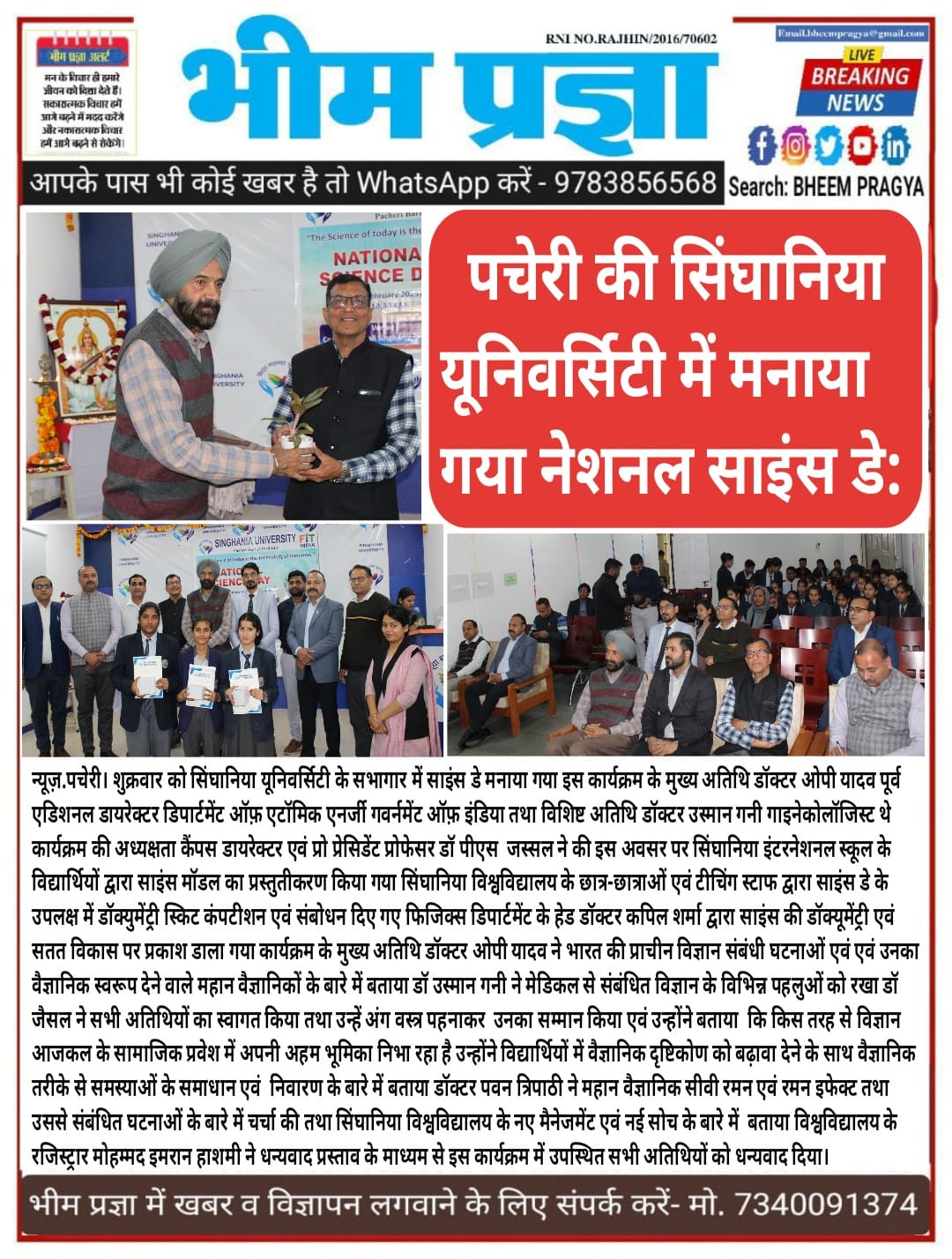 National Science Day celebrated at Singhania University March 1, 2025 Anju Gupta 0 पचेरी की सिंघानिया यूनिवर्सिटी में मनाया गया नेशनल साइंस डे: