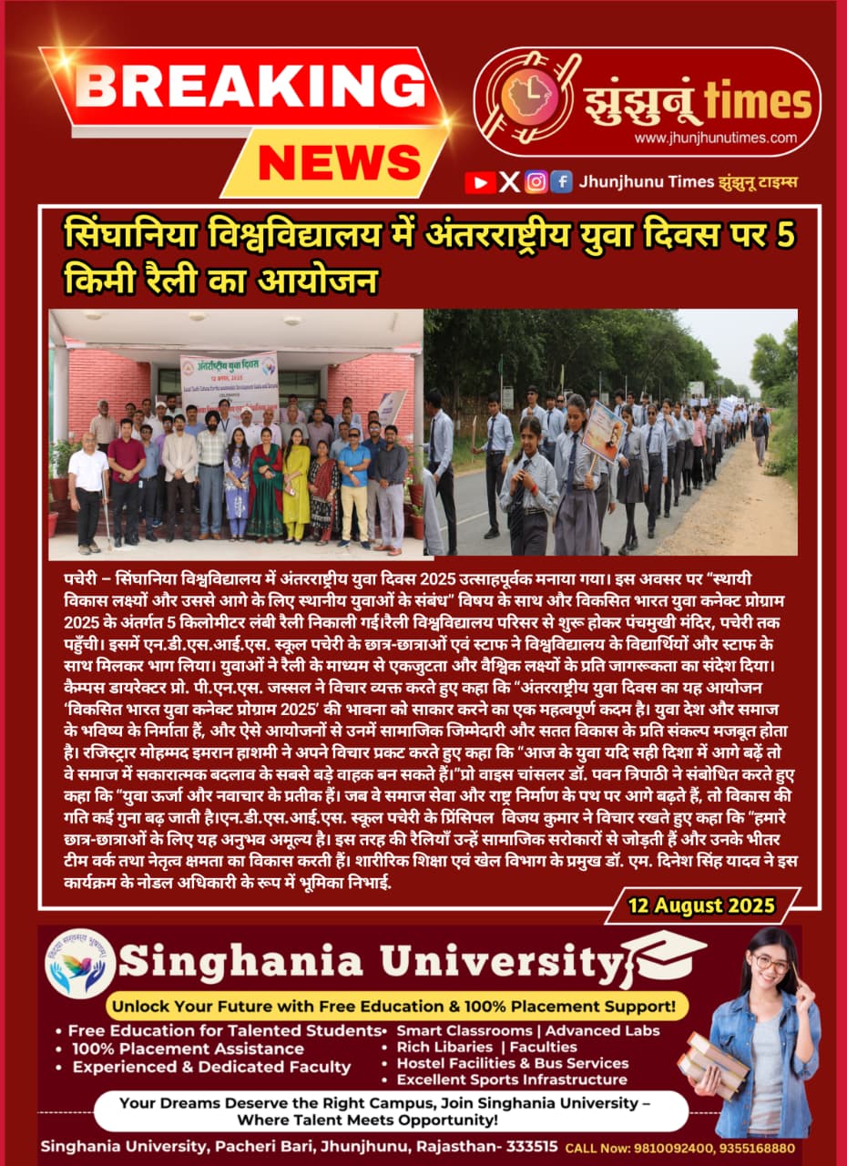 अंतरराष्ट्रीय युवा दिवस पर सिंघानिया विश्वविद्यालय ने 5 किमी रैली का आयोजन किया