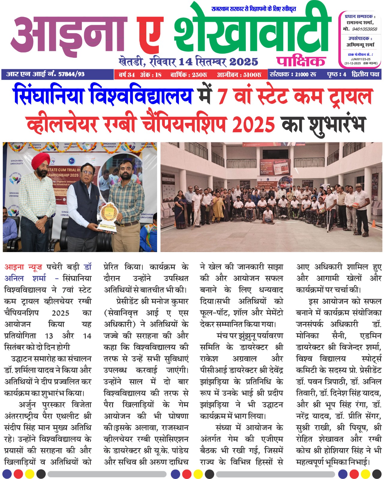 सिंघानिया विश्वविद्यालय में 7वाँ स्टेट-कम-ट्रायल व्हीलचेयर रग्बी चैंपियनशिप 2025 का उद्घाटन समारोह आयोजित