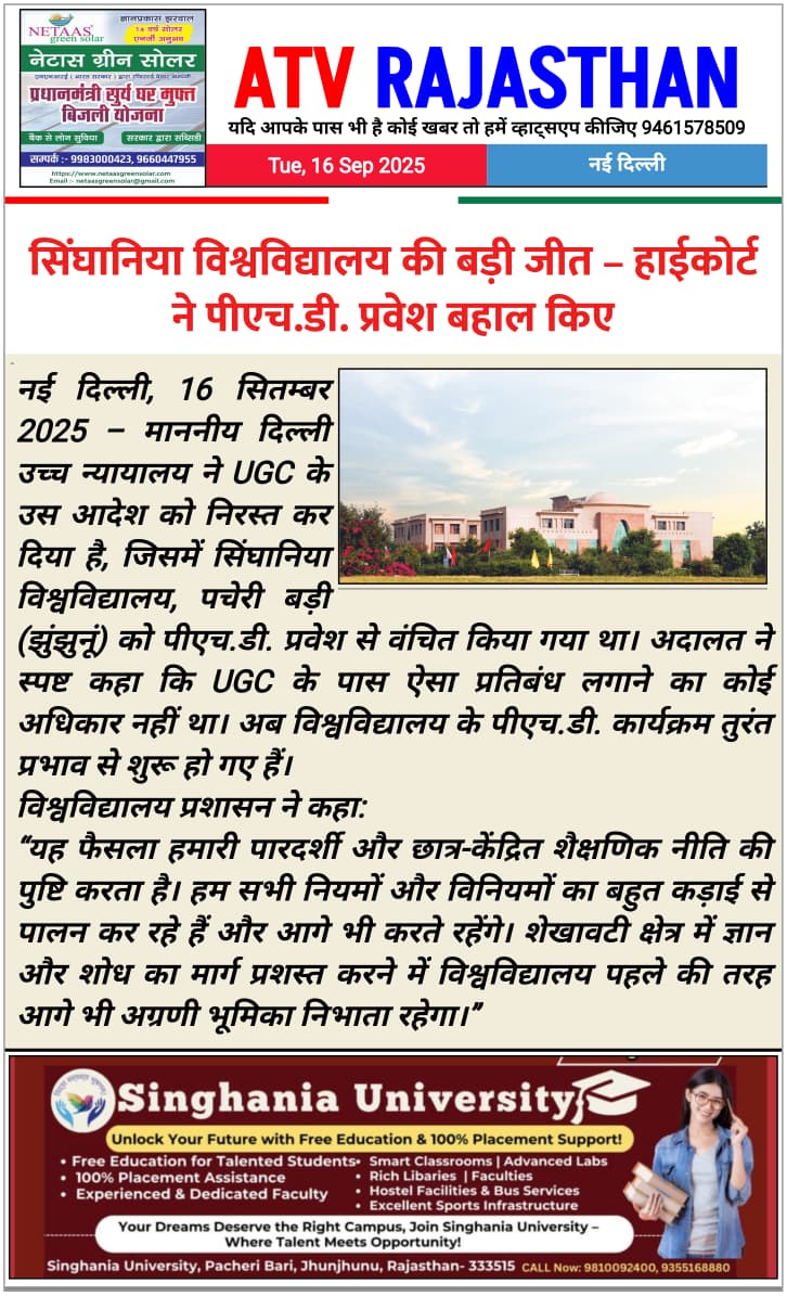 माननीय उच्च न्यायालय की मंजूरी के बाद सिंघानिया विश्वविद्यालय में पीएचडी प्रवेश फिर से शुरू