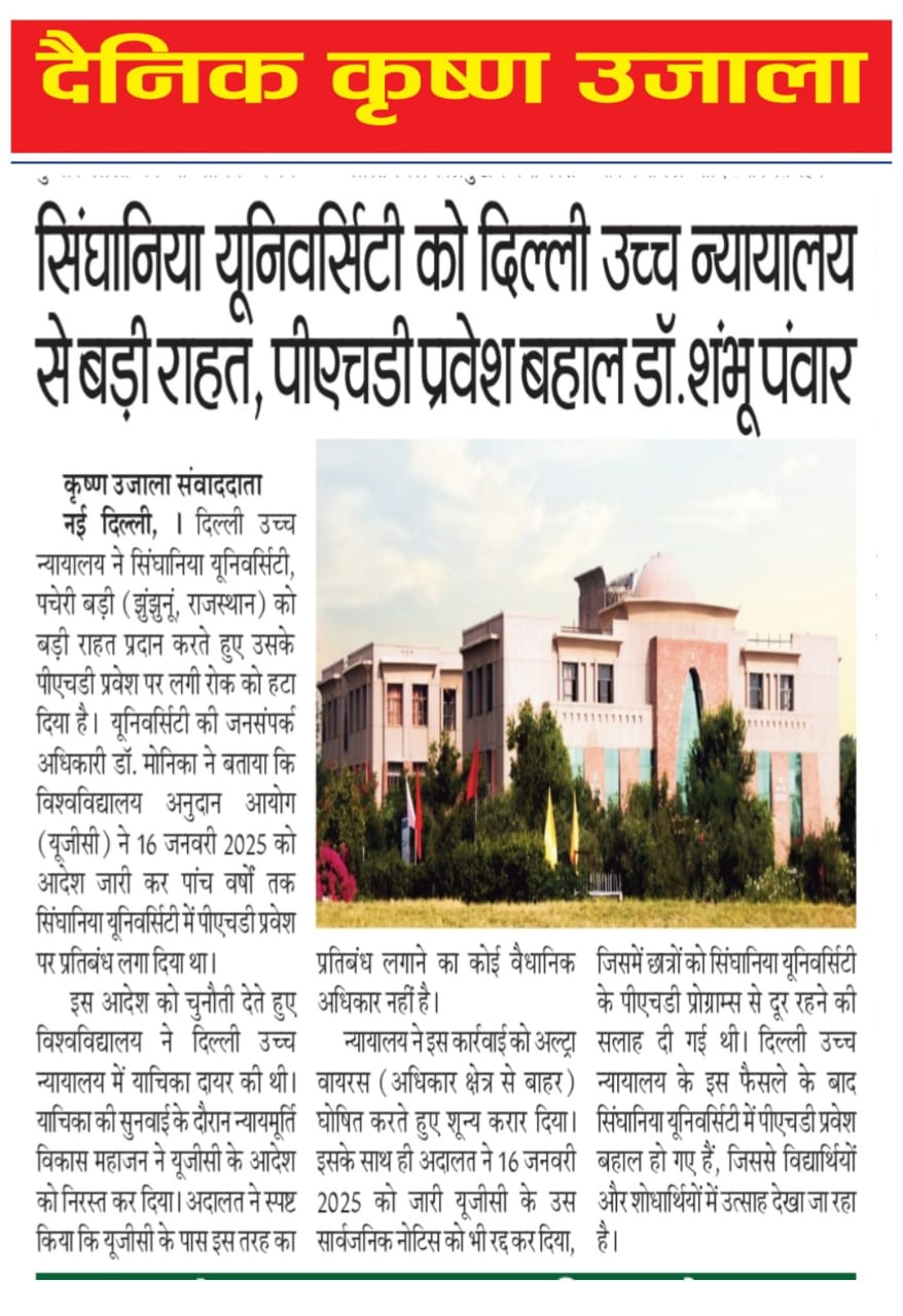 माननीय दिल्ली उच्च न्यायालय की मंजूरी के साथ सिंघानिया विश्वविद्यालय में पीएचडी प्रवेश फिर से शुरू