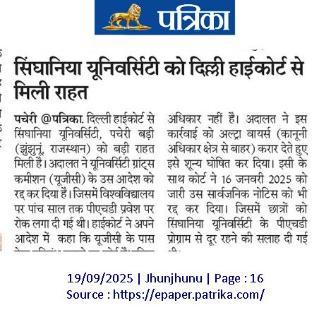 PhD Programs at Singhania University restarted following Hon’ble Delhi High Court’s approval September 19, 2025 Anju Gupta 0