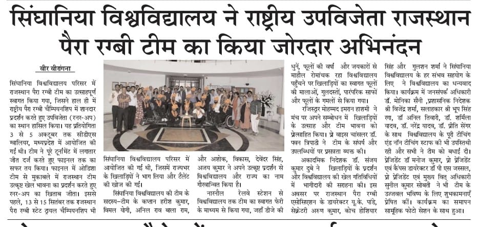 • Next Singhania University honoured the Rajasthan Para Rugby Team for achieving the National Runner-up title
