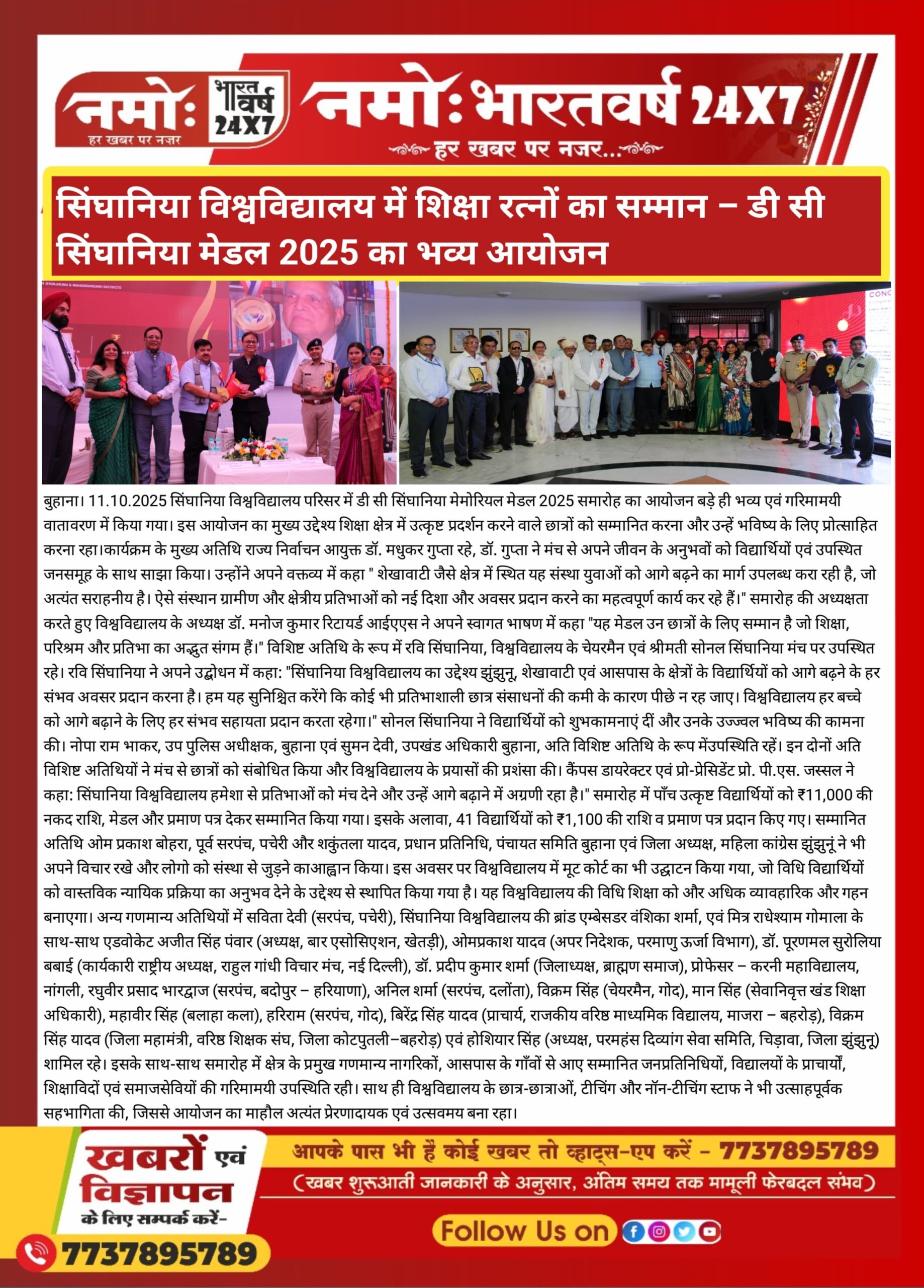 शैक्षणिक उत्कृष्टता का उत्सव सिंघानिया विश्वविद्यालय ने डी.सी. सिंघानिया मेमोरियल मेडल समारोह के माध्यम से मनाया, जिसमें चयनित विद्यार्थियों को ₹11,000 की नकद राशि, मेडल एवं प्रमाण पत्र प्रदान कर सम्मानित किया गया