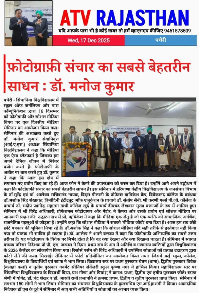• Next One-Day Seminar on Photography and Social Media held at Singhania University; Photography Is the Most Powerful Medium of Communication: Dr. Manoj Kumar