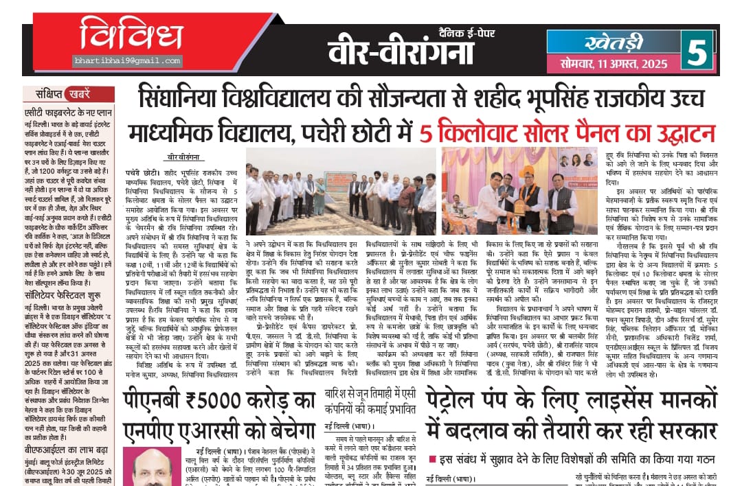 सिंघानिया विश्वविद्यालय ने शहीद भूपसिंह राजकीय उच्च माध्यमिक विद्यालय, पचेरी छोटी में 5 किलोवाट सौर ऊर्जा संयंत्र दान किया