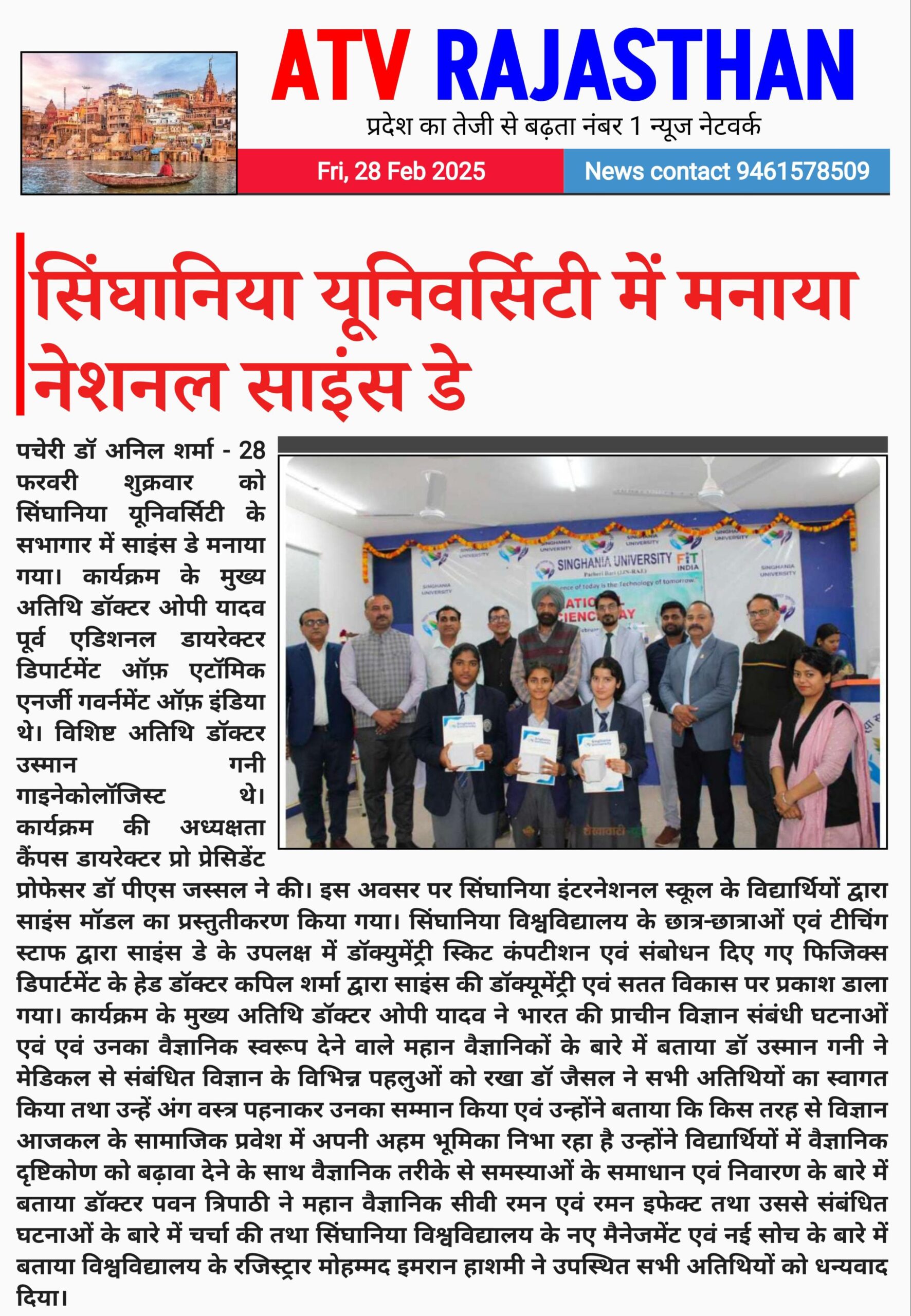 Singhania University Highlights Importance of Science on National Science Day March 1, 2025 Anju Gupta 0 सिंघानिया यूनिवर्सिटी में मनाया नेशनल साइंस डे