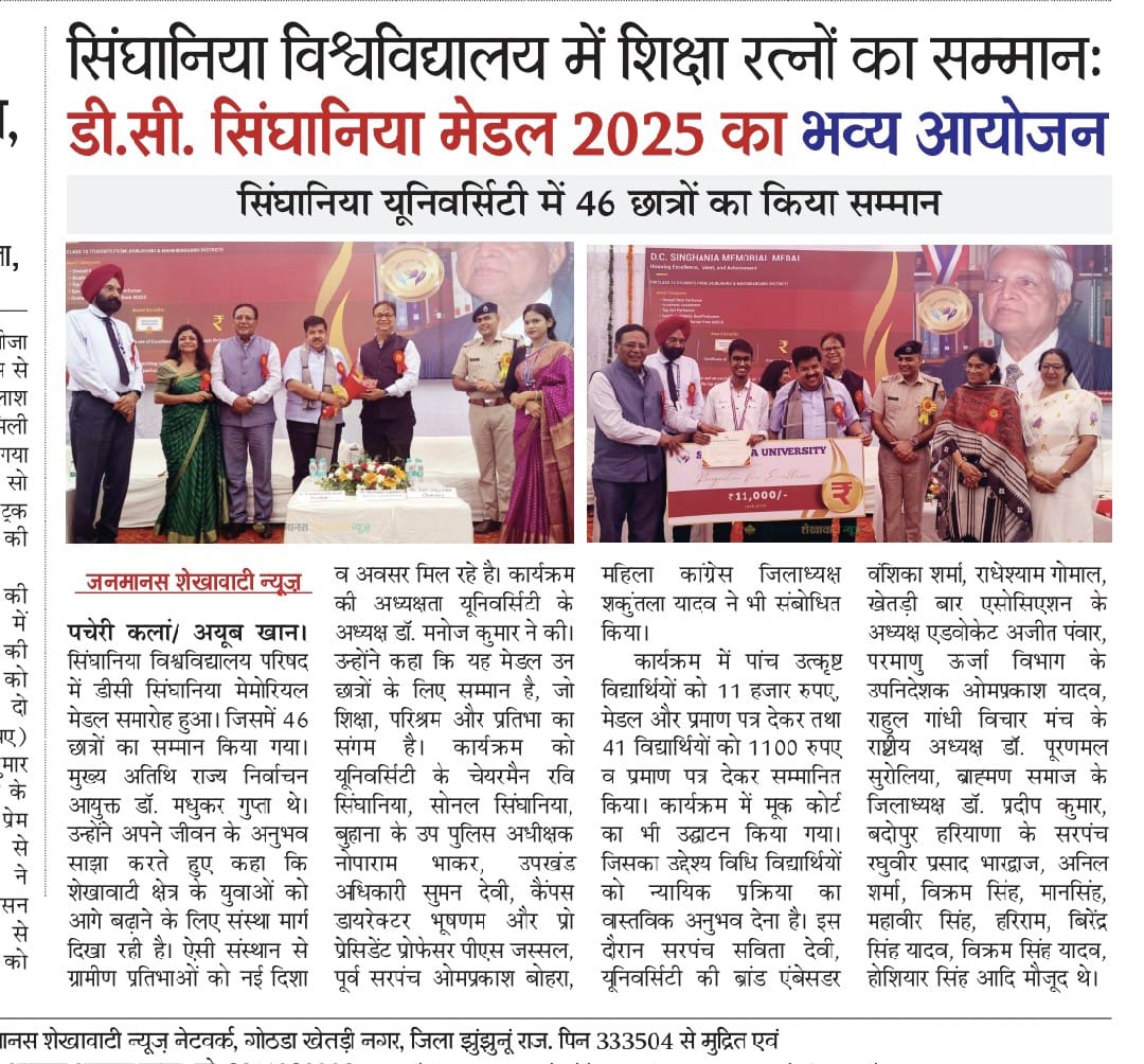 सिंघानिया विश्वविद्यालय में आयोजित डी.सी. सिंघानिया मेमोरियल मेडल समारोह में राज्य चुनाव आयुक्त डॉ. मधुकर गुप्ता, डीवाईएसपी बुहाना श्री नोपाराम भाकर, एसडीएम बुहाना सुश्री सुमन देवी, महिला कांग्रेस जिला अध्यक्ष शकुंतला यादव तथा पूर्व सरपंच ओमप्रकाश बोहरा की गरिमामयी उपस्थिति में मेधावी छात्रों को सम्मानित किया गया