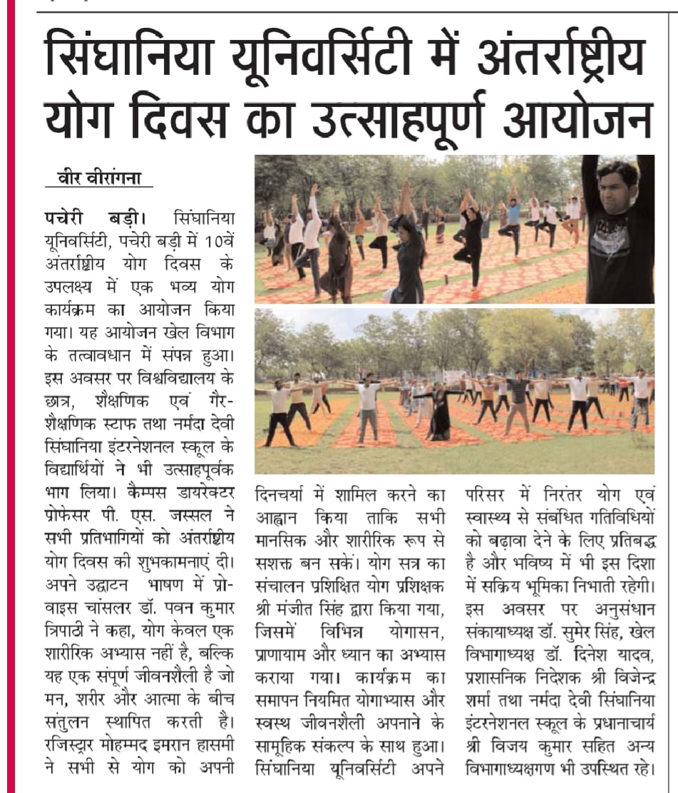 सिंघानिया विश्वविद्यालय ने अंतर्राष्ट्रीय योग दिवस का उत्साहपूर्वक आयोजन किया