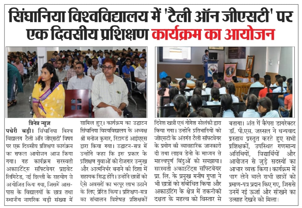 प्रतिभागियों को प्रशिक्षित करने हेतु सिंघानिया विश्वविद्यालय ने ‘टैली विद जीएसटी’ पर एक दिवसीय प्रशिक्षण कार्यक्रम आयोजित किया