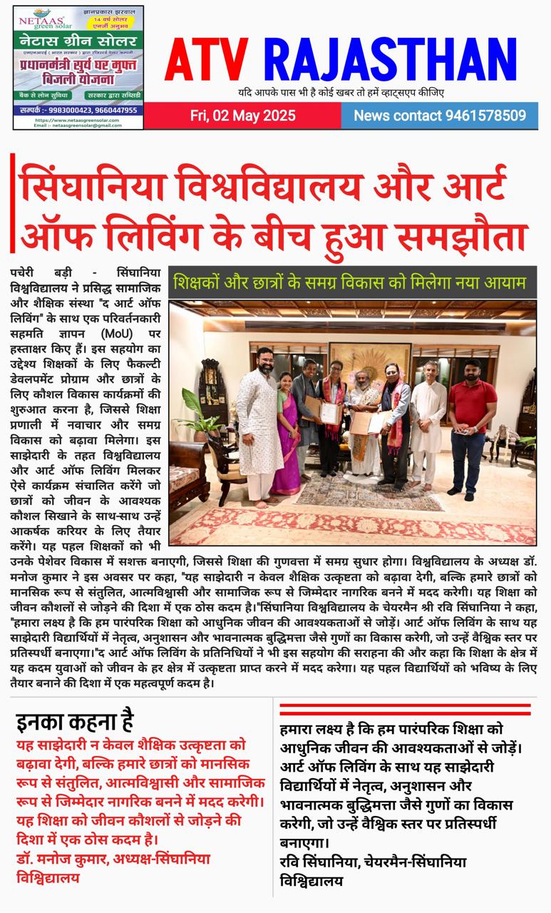 Singhania University partners with The Art of Living May 2, 2025 Anju Gupta 0 सिंघानिया यूनिवर्सिटी ने द आर्ट ऑफ लिविंग के साथ की साझेदारी