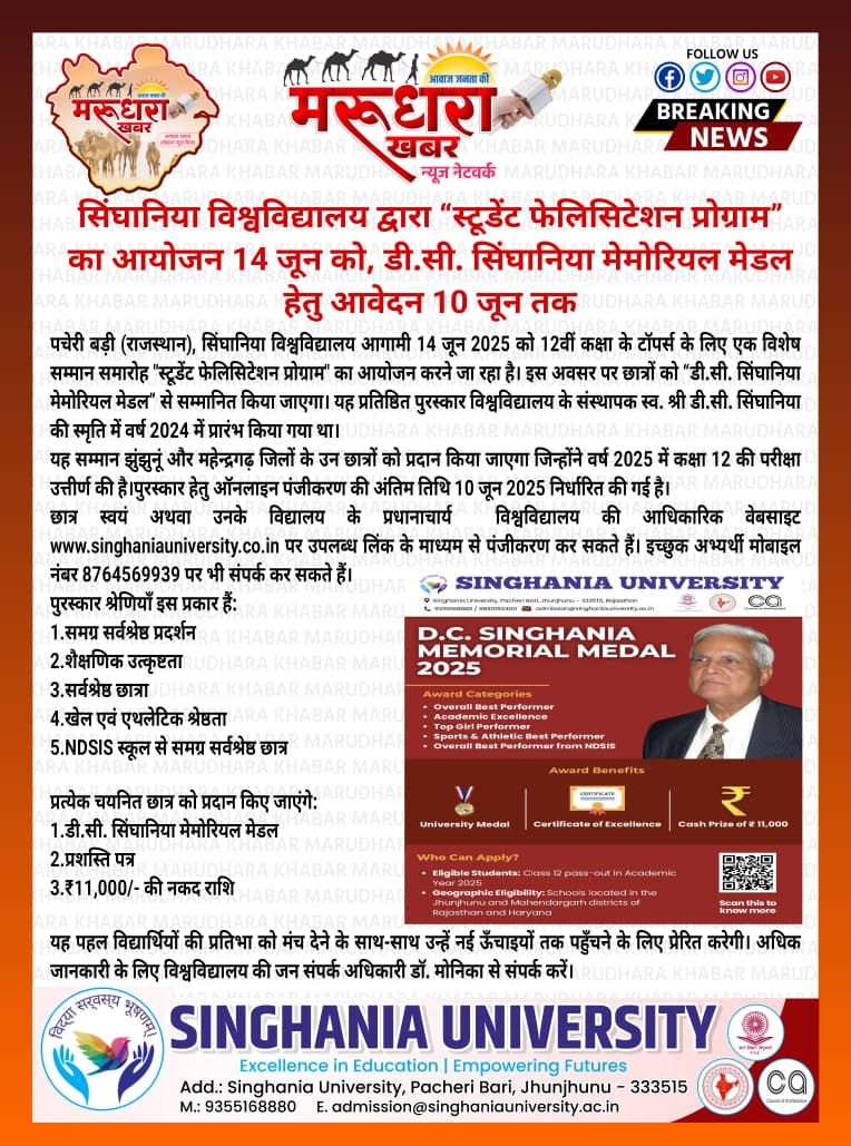 सिंघानिया विश्वविद्यालय 14 जून 2025 को “स्टूडेंट फेलिसिटेशन प्रोग्राम” का आयोजन गर्व से कर रहा है, जिसमें प्रतिष्ठित डी.सी. सिंघानिया स्मृति पदक प्रदान किया जाएगा