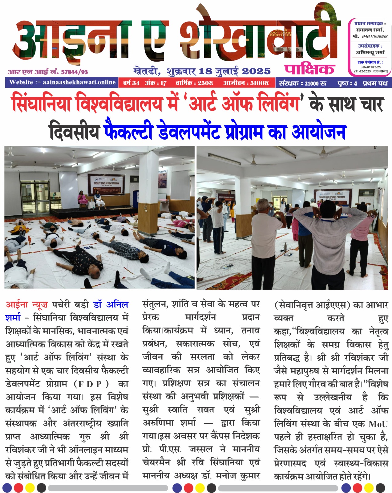 सिंघानिया विश्वविद्यालय ने द आर्ट ऑफ लिविंग फाउंडेशन के सहयोग से सफलतापूर्वक चार दिवसीय फैकल्टी डेवलपमेंट प्रोग्राम आयोजित किया