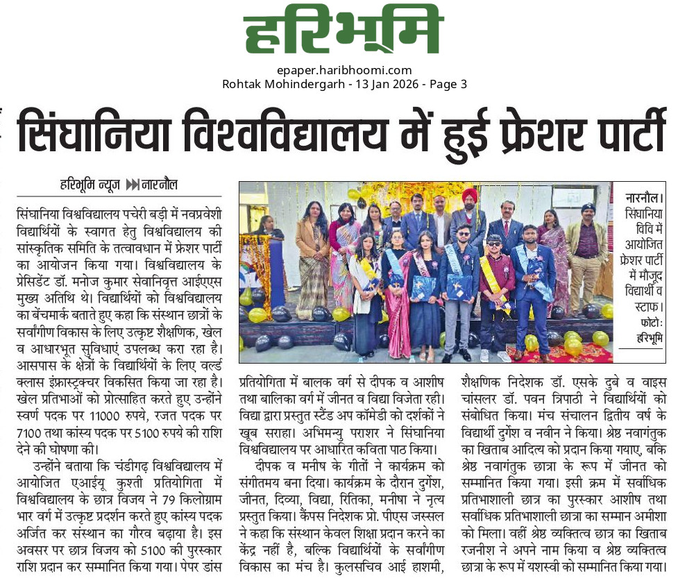 Singhania University welcomes freshers with a grand celebration full of joy and smiles January 13, 2026 Anju Gupta 0