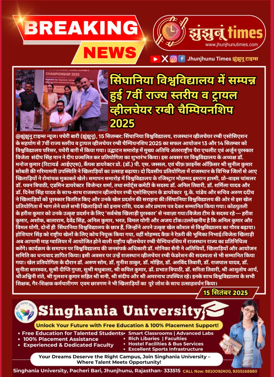 सिंघानिया विश्वविद्यालय ने 7वाँ स्टेट-कम-ट्रायल व्हीलचेयर रग्बी चैंपियनशिप 2025 का समापन देखा