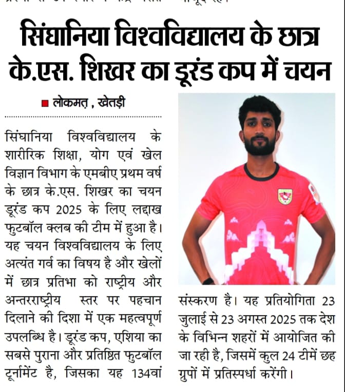 Singhania University’s K.S. Shikhar Selected to Play for Ladakh Football Club in Durand Cup 2025