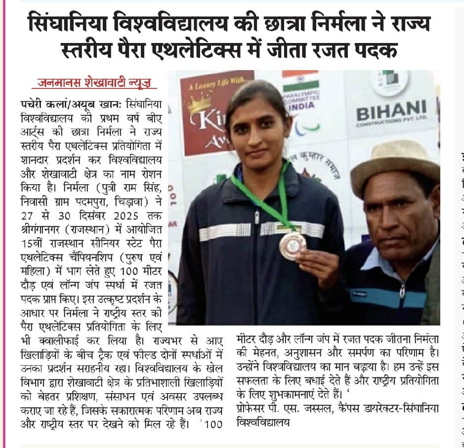 Singhania University’s student Ms. Nirmala secured Silver Medal and brought pride to the University January 1, 2026 Anju Gupta 0