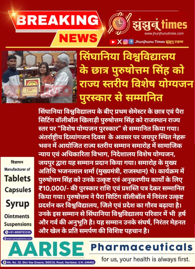 Singhania University’s Student Purushottam Singh won prestigious State-Level Specially-Abled Award December 5, 2025 Anju Gupta 0