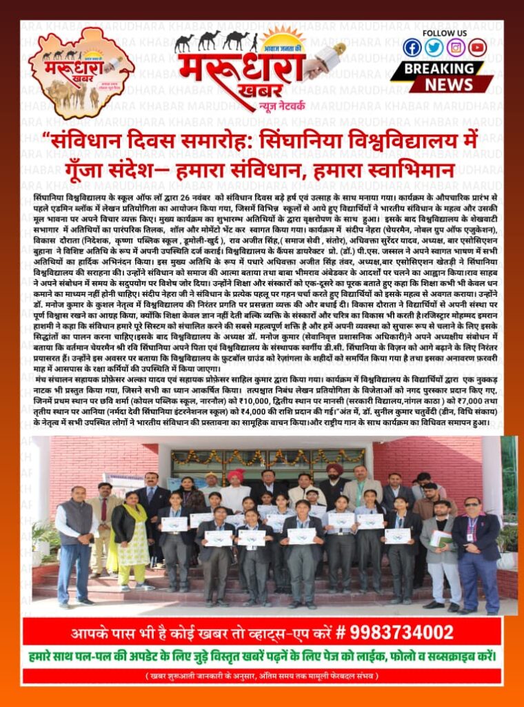 Constitution Day celebrated at Singhania University highlight ‘Our Constitution, Our Pride’ November 26, 2025 Anju Gupta 0