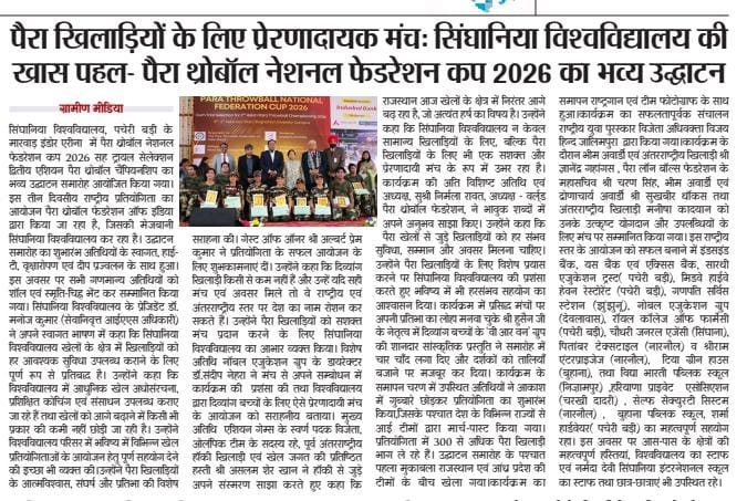 Empowering Para Athletes: Grand opening of Para Throwball National Federation Cup 2026 at Singhania University February 3, 2026 Paresh 0