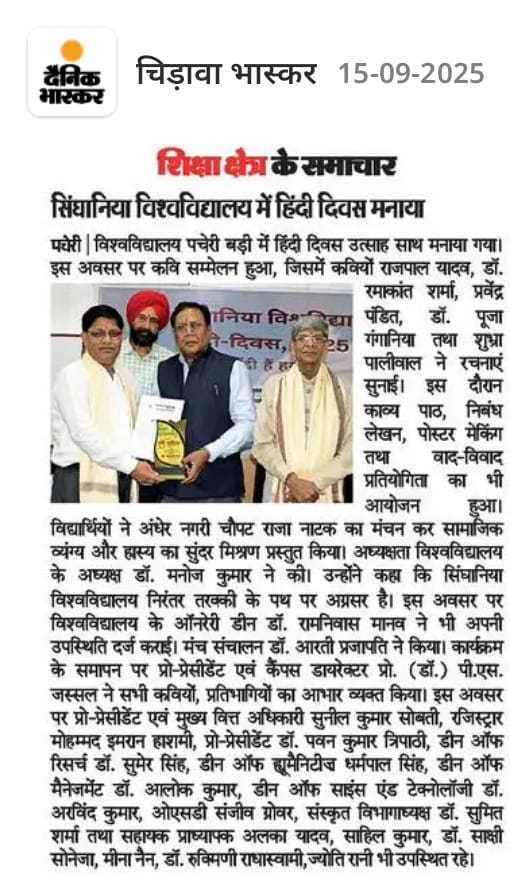 Hindi Diwas celebrated at Singhania University September 15, 2025 Satyam 0 सिंघानिया विश्वविद्यालय में हिंदी दिवस का आयोजन