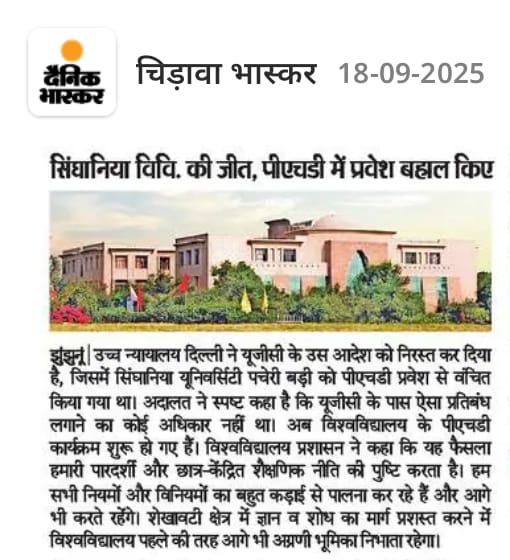 Hon’ble Delhi High Court permitted Singhania University to admit new PhD scholars September 18, 2025 Anju Gupta 0
