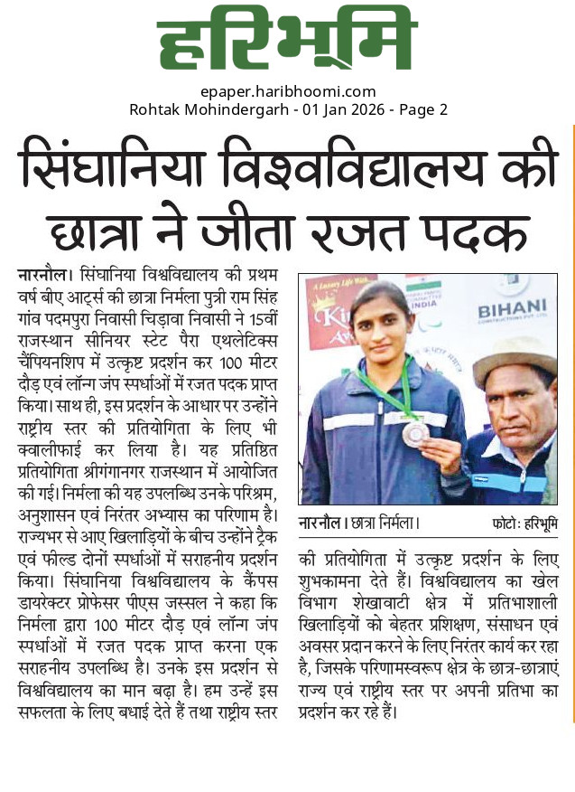 Ms. Nirmala, Student of Singhania University won Silver Medal, making the University proud January 1, 2026 Anju Gupta 0
