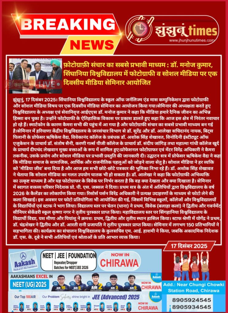 One-Day Seminar on Photography and Social Media held at Singhania University; Photography Is the Most Powerful Medium of Communication: Dr. Manoj Kumar December 17, 2025 Anju Gupta 0