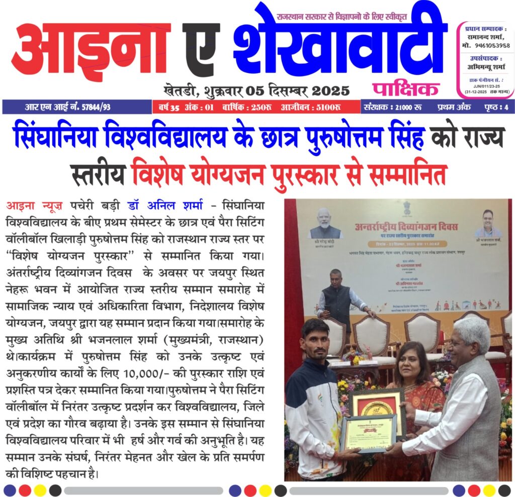 Purushottam Singh, Student of Singhania University won State-Level Specially-Abled Award December 6, 2025 Anju Gupta 0