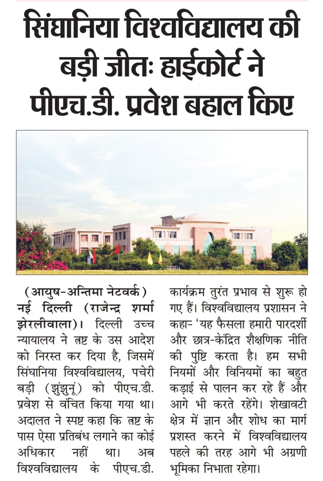 Singhania University gets approval for PhD Admissions from Hon’ble Delhi High Court September 17, 2025 Satyam 0 सिंघानिया विश्वविद्यालय को माननीय दिल्ली उच्च न्यायालय से पीएचडी प्रवेश की मंजूरी मिली