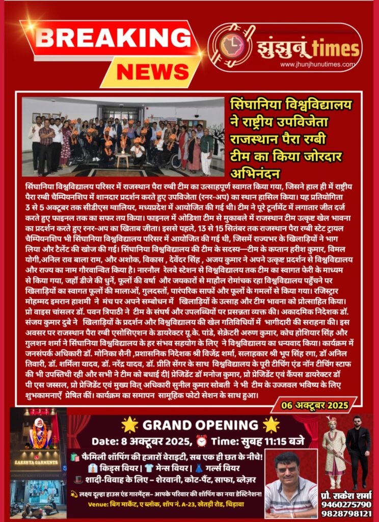 Singhania University honoured the Rajasthan Para Rugby Team for achieving the National Runner-up title October 6, 2025 Anju Gupta 0