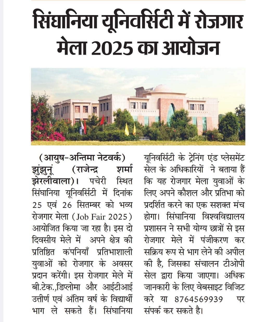 Singhania University organized Job Fair 2025, bringing students and top companies together September 26, 2025 Satyam 0 सिंघानिया विश्वविद्यालय ने जॉब फेयर 2025 का आयोजन किया, छात्रों और शीर्ष कंपनियों को एक साथ लाया