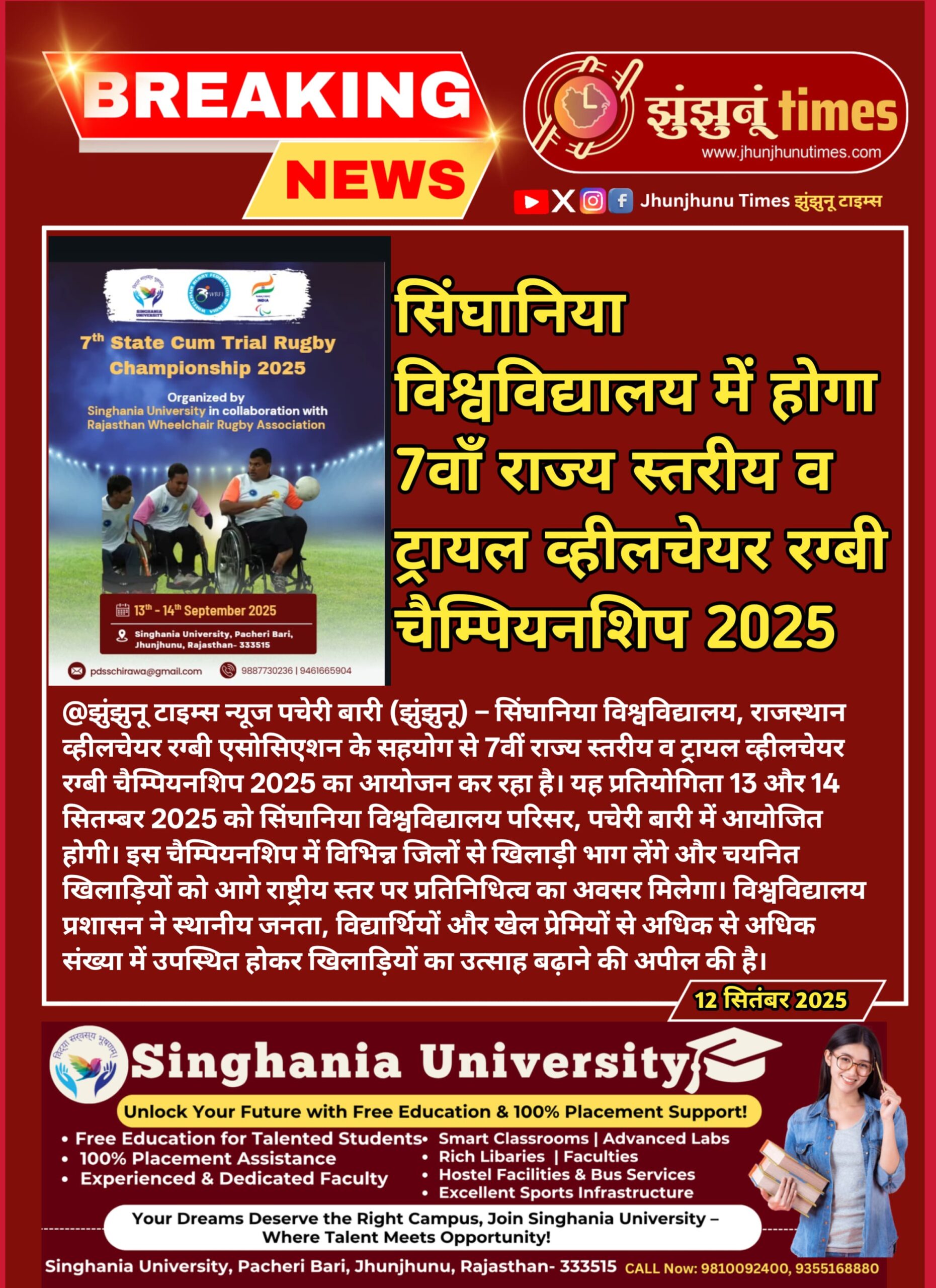 The 7th State-cum-Trial Wheelchair Rugby Championship 2025 to Take Place at Singhania University on 13th 14th September