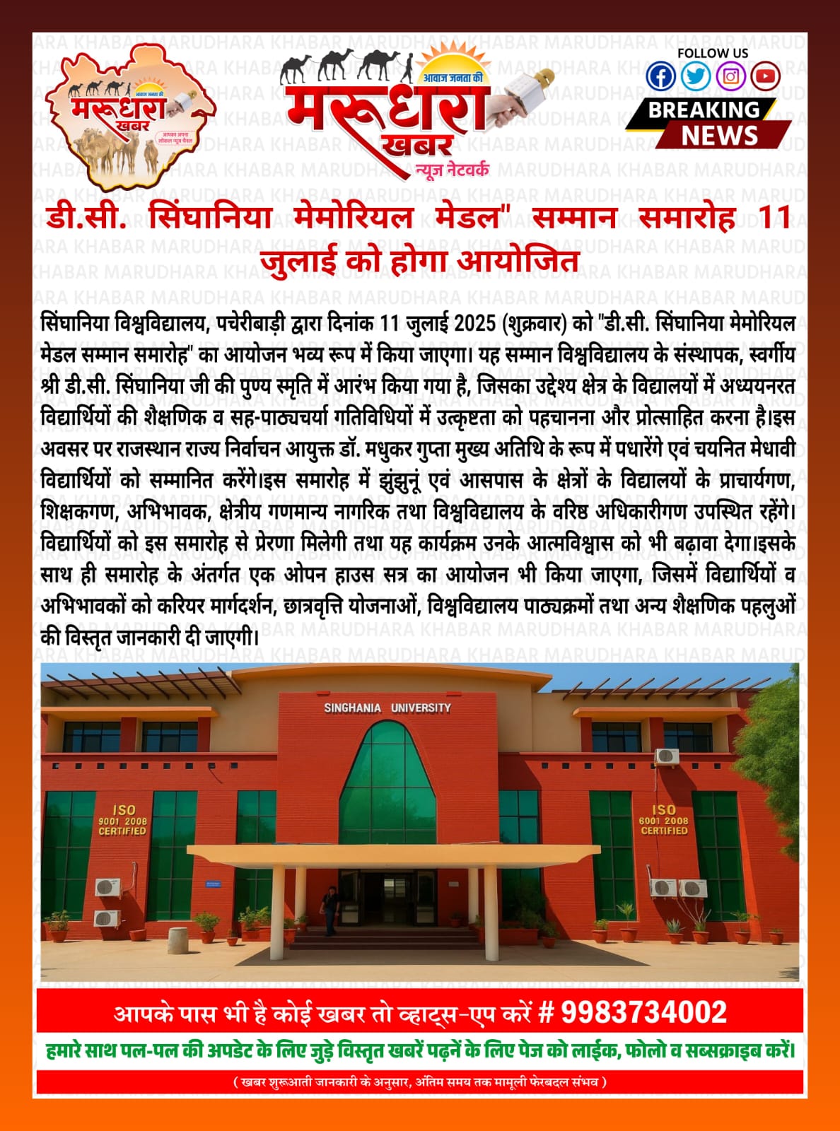 ‘डी.सी. सिंघानिया मेमोरियल मेडल’ पुरस्कार समारोह 11 जुलाई को सिंघानिया विश्वविद्यालय में आयोजित होगा
