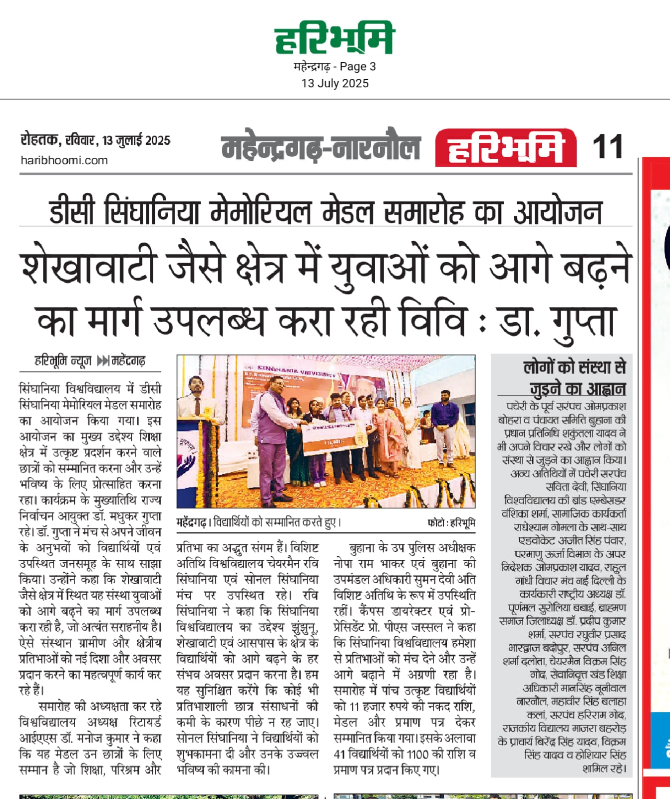 ‘डी.सी. सिंघानिया मेमोरियल मेडल’ समारोह शैक्षणिक प्रतिबद्धता और प्रतिभा को समर्पित रहा