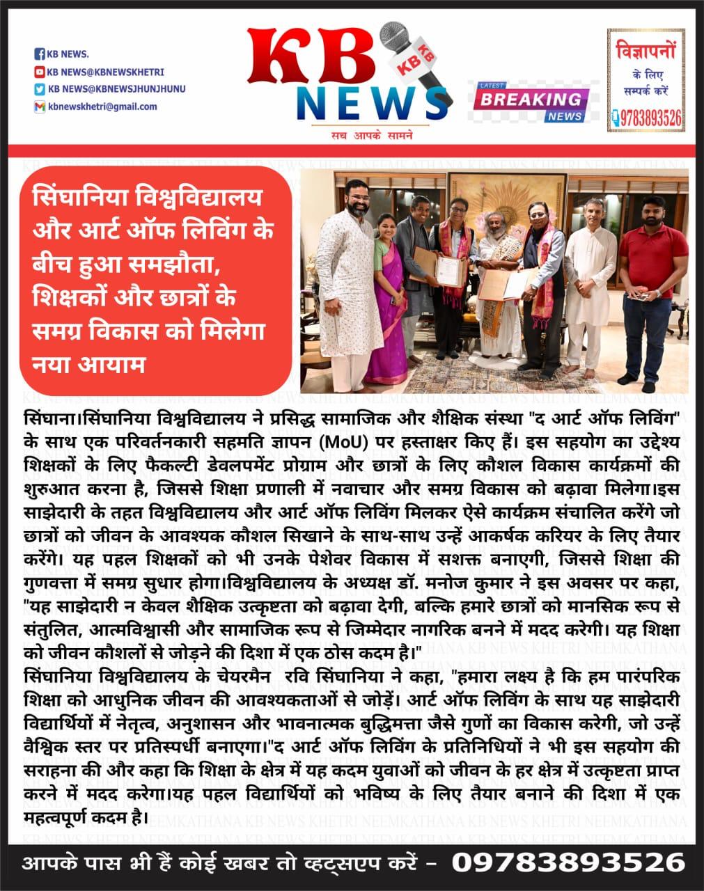 सिंघानिया विश्वविद्यालय और द आर्ट ऑफ लिविंग के बीच हुआ MOU, शिक्षकों और छात्रों के समग्र विकास को मिलेगा नया आयाम